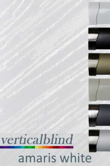 Complete Vertical Blind in Amaris White fabric made to measure including all fixtures and fittings with a choice of rail finish, control and draw.